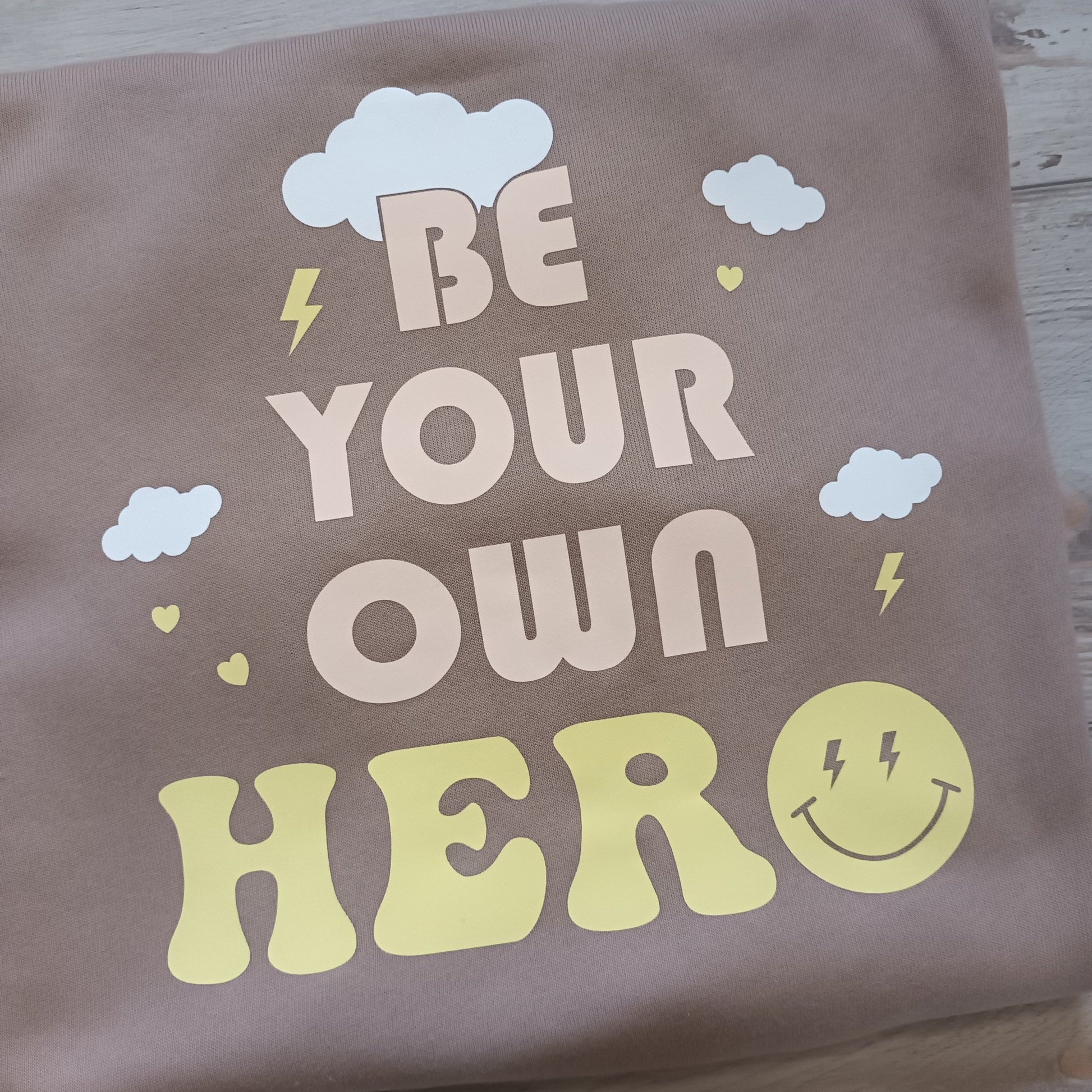 ✨ Okay, let's talk about this design! 🤩 It's a total mood booster! The playful combination of clouds, lightning bolts, and a smiley face woven into the bold "Be Your Own Hero" design radiates positivity and energy. Oh, and did we mention the lightning bolt on the front? Double the design, double the inspiration!