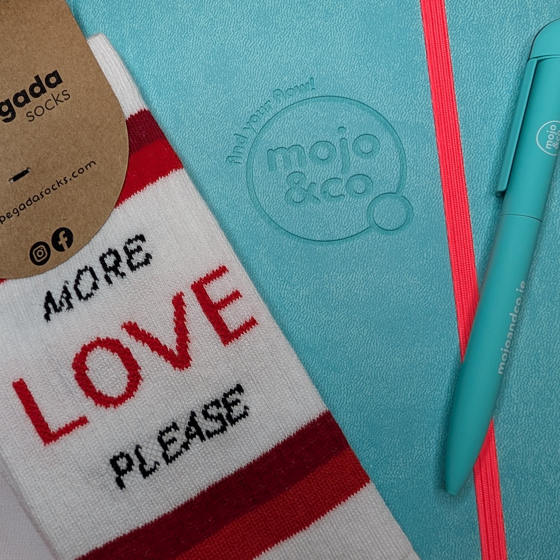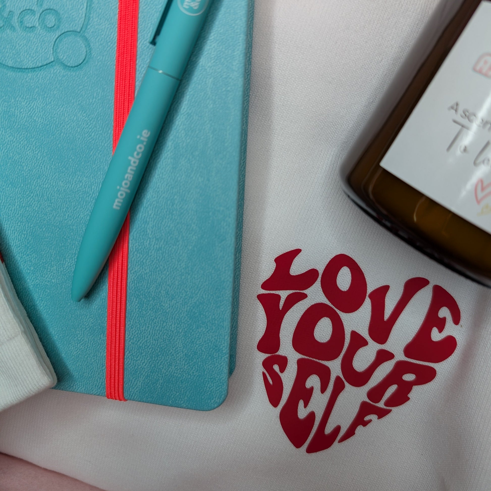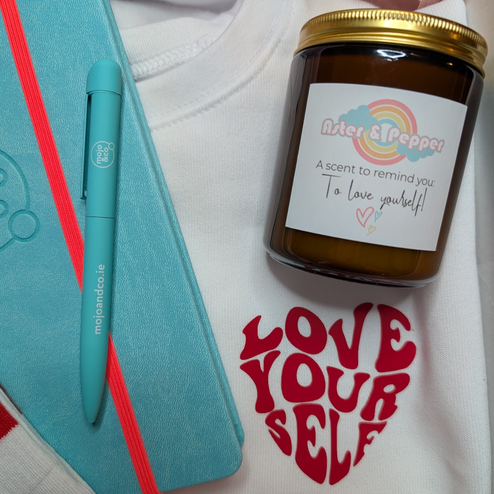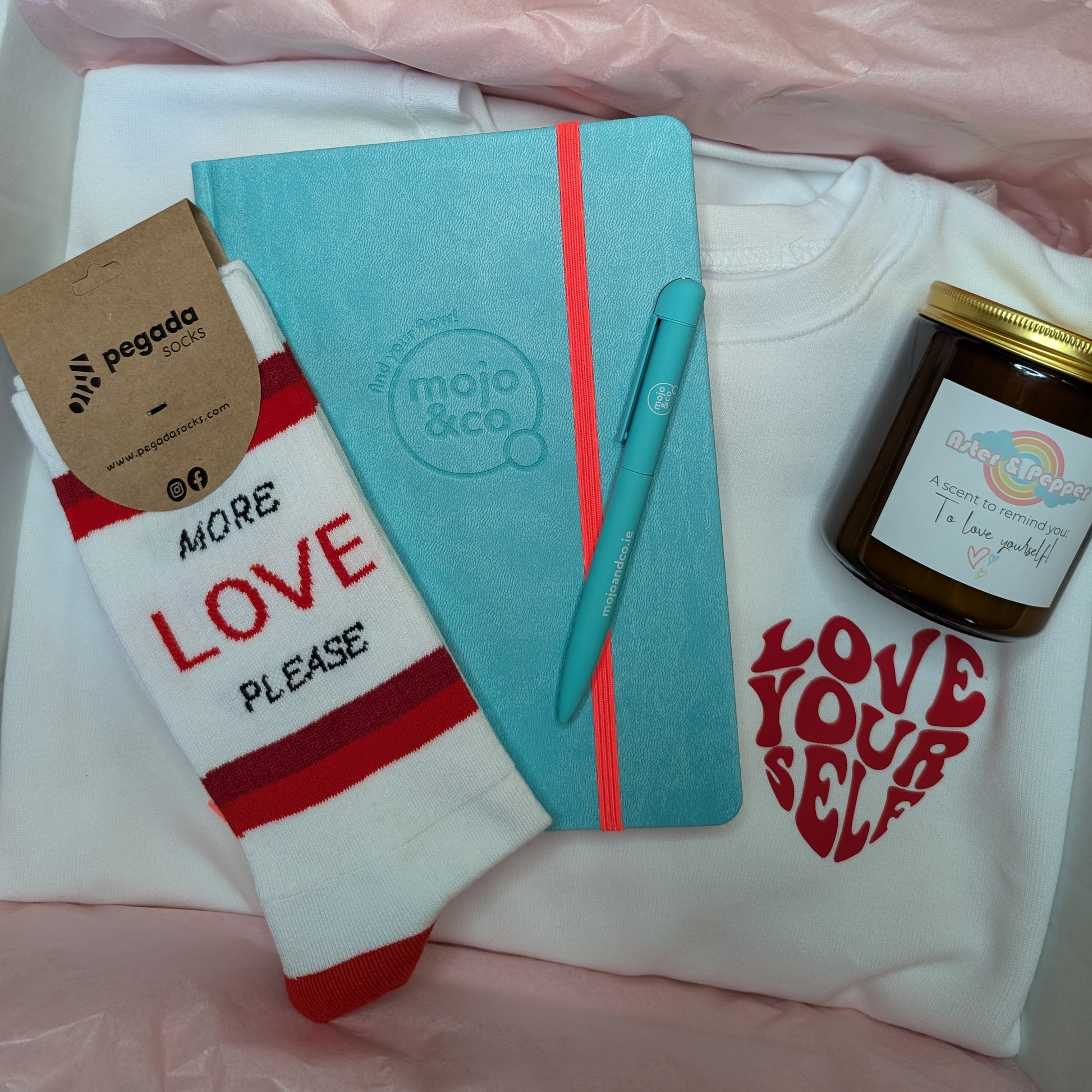 Slip into our exclusive 'Love Yourself' sweatshirt, light our hand-poured Lily & Rose scented candle (crafted just for us!), and settle in with your Mojo & Co. Positivity Journal and cosy 'More Love, Please' socks.