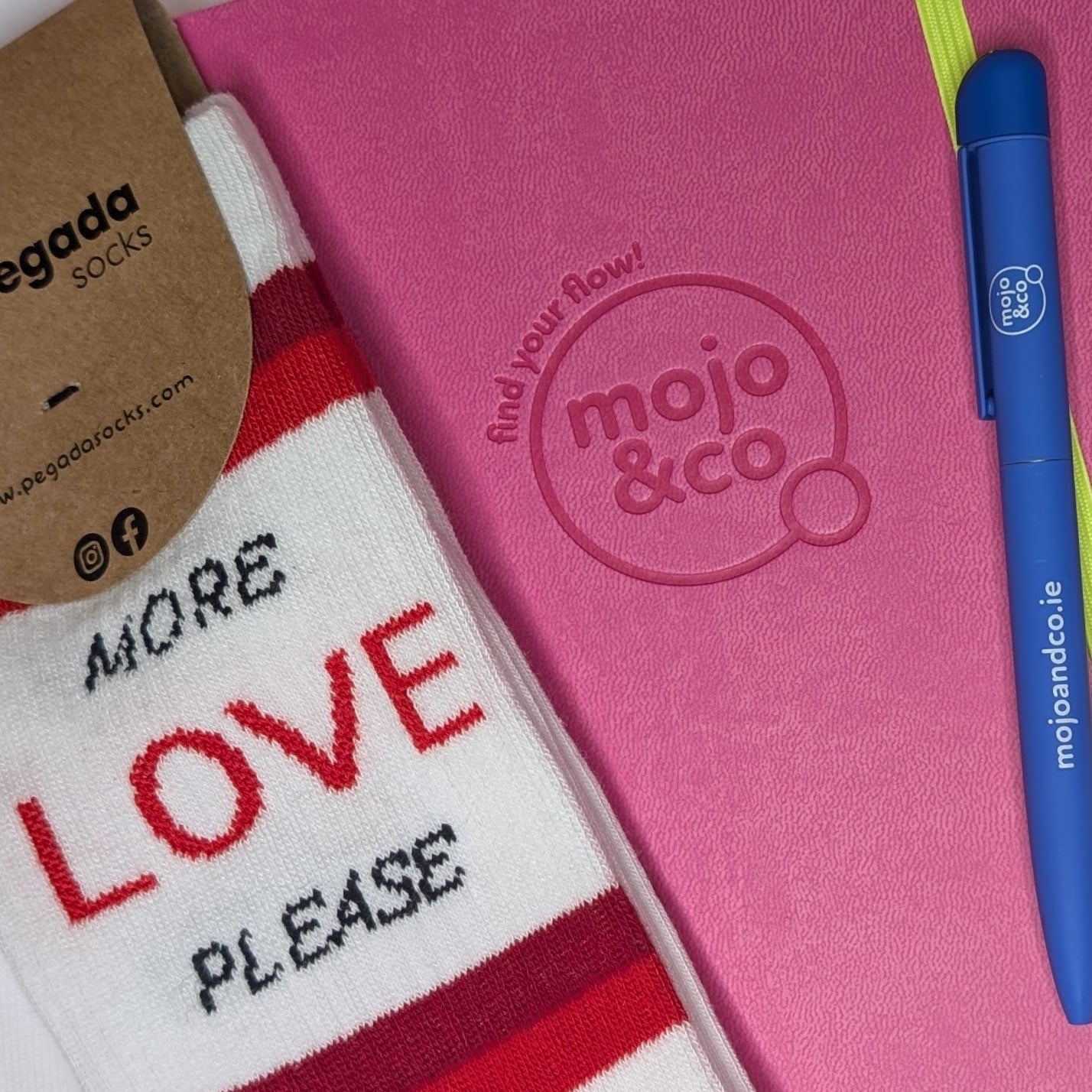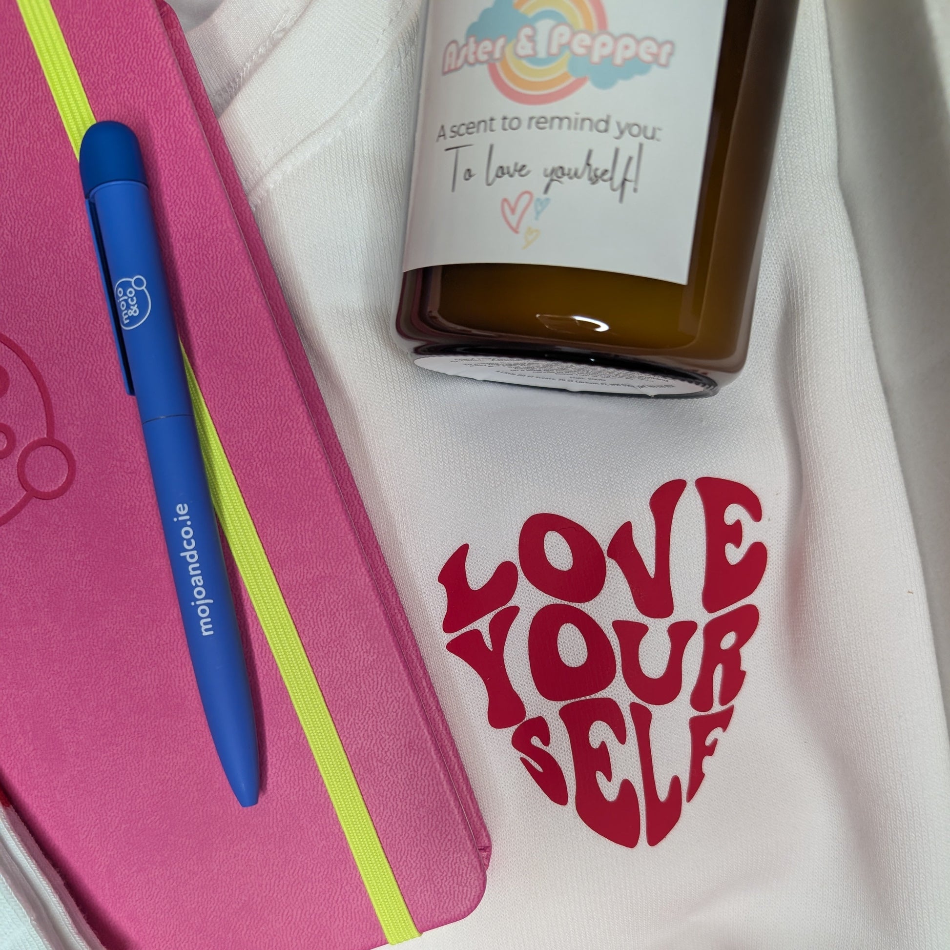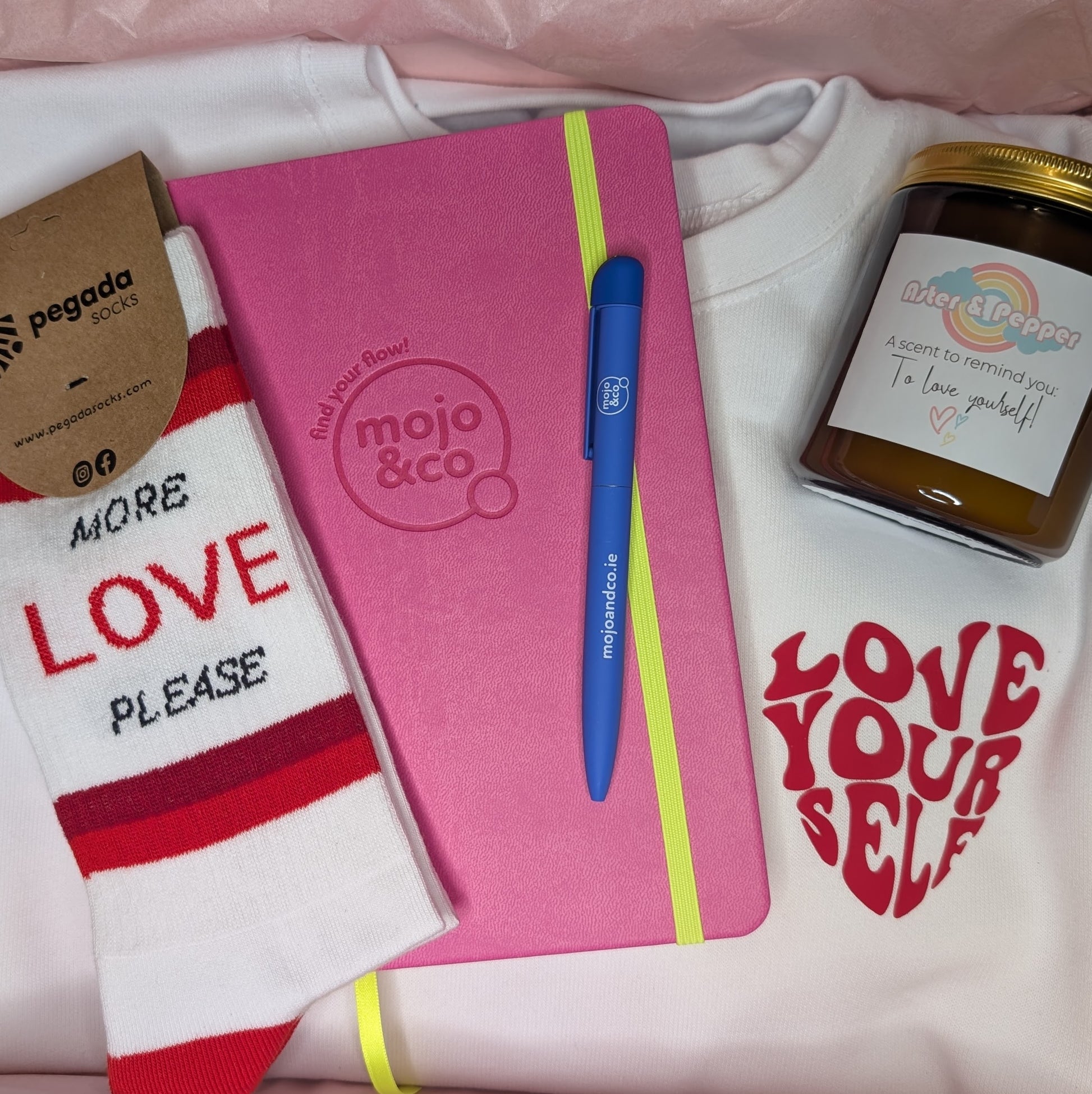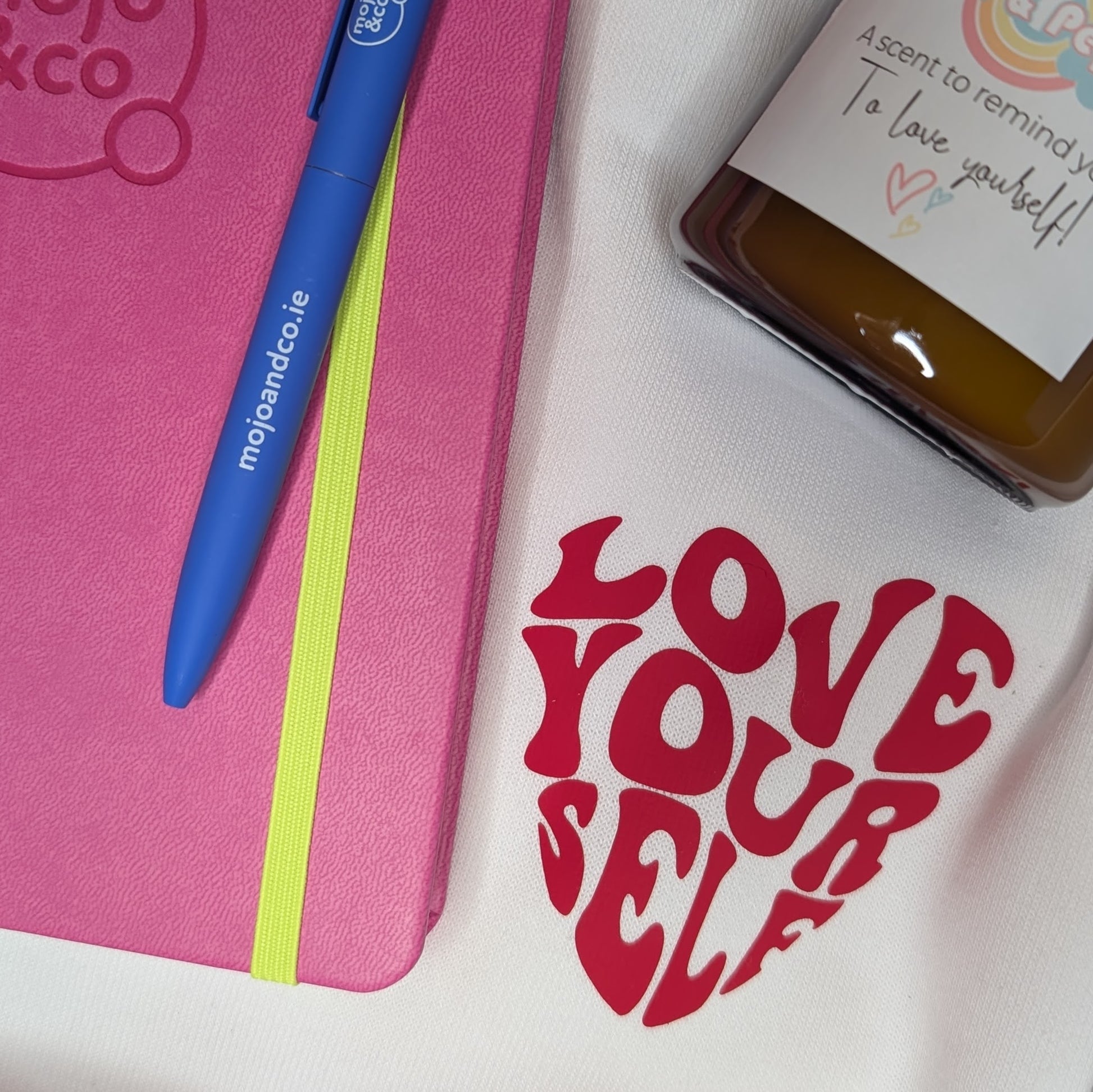 Slip into our exclusive 'Love Yourself' sweatshirt, light our hand-poured Lily & Rose scented candle (crafted just for us!), and settle in with your Mojo & Co. Brain Dump Journal and cosy 'More Love, Please' socks.